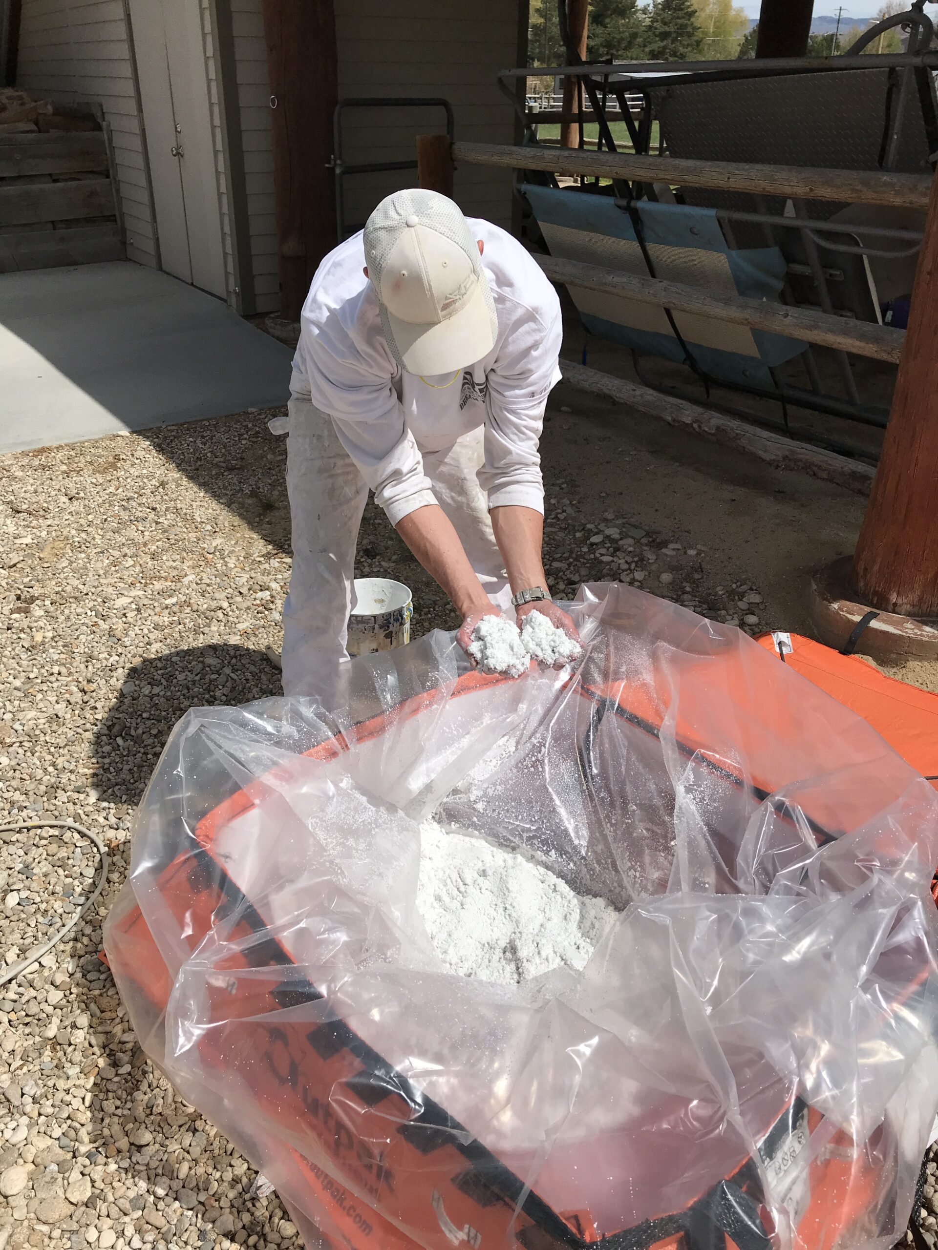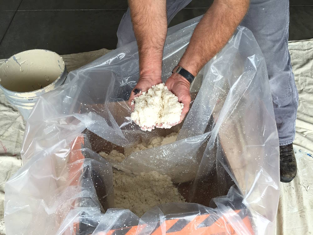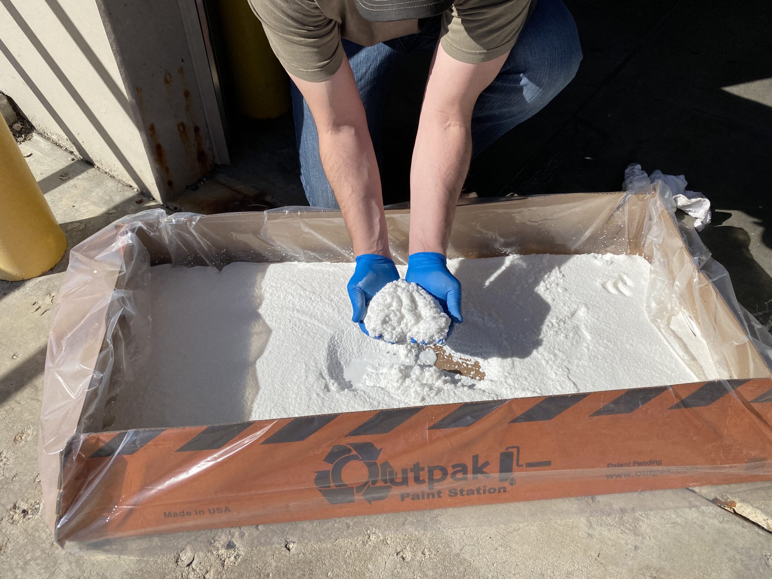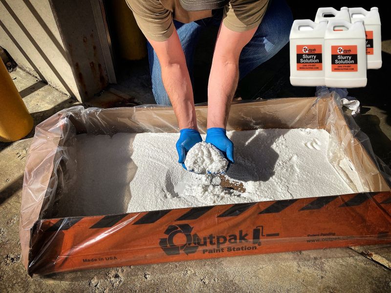 Mix Outpak Slurry Solution into any water-based slurry waste, including concrete, mortar, and paint slurry. Your slurry will solidify into a wet sand consistency and be ready to dispose of in any standard waste container.